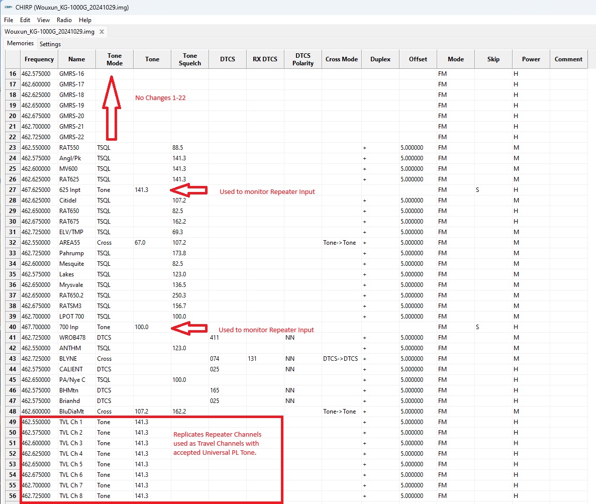 To get things started, here is the programming I used for my Wouxun KG1000-G. The info here is probably out of date, but you get the gist of what I did for me. Operators have the options of arranging how it best suits them. Note: The KG1000-G + is basically the same as the non-+. The differences are in the settings Tab. I strongly encourage new operators to learn what the Setting are via the Menu Options in the Owners Manual.