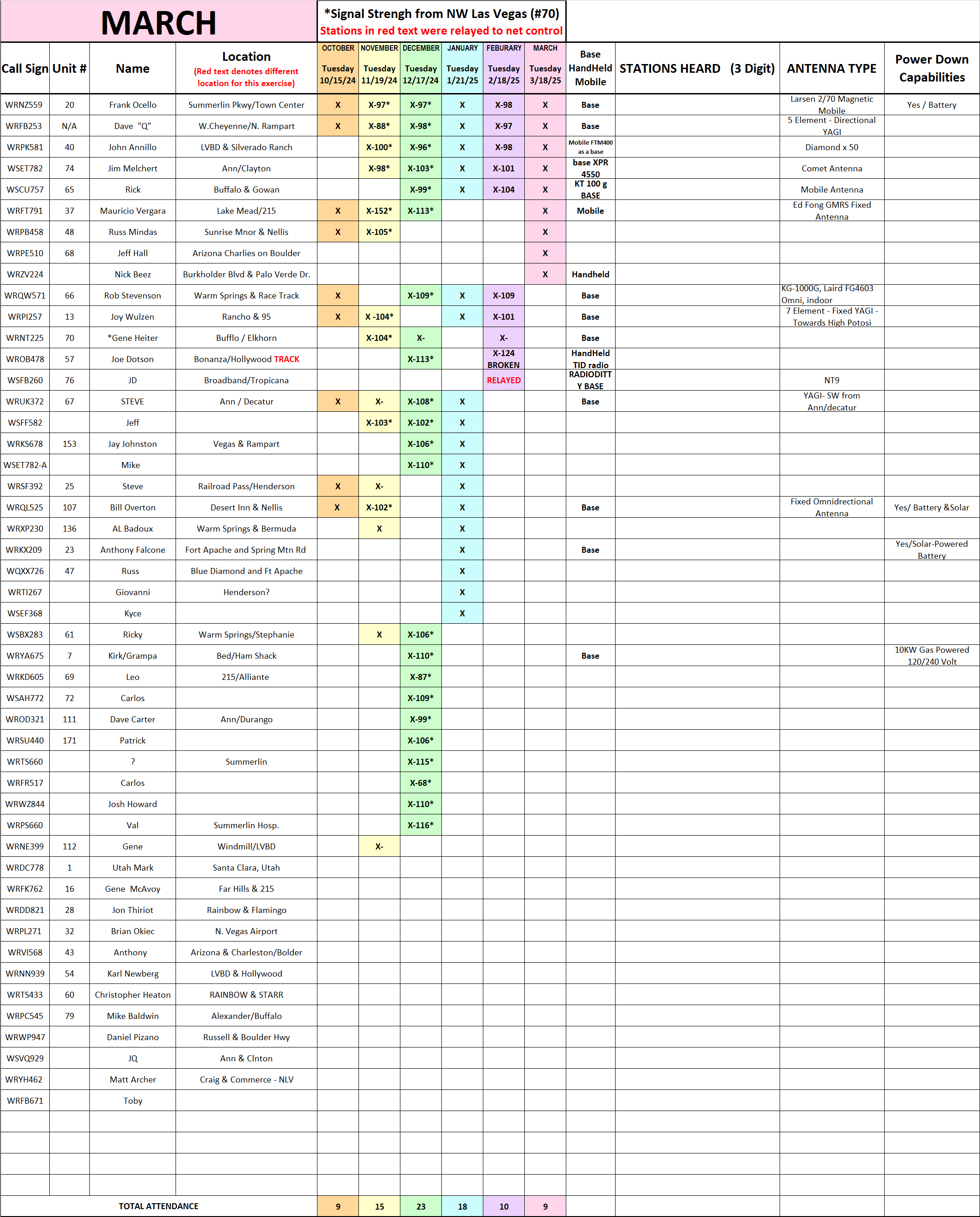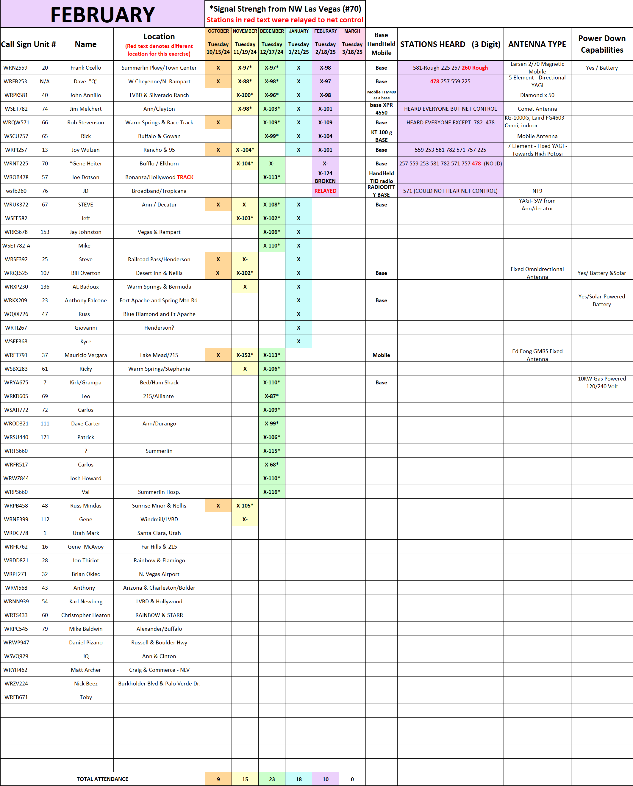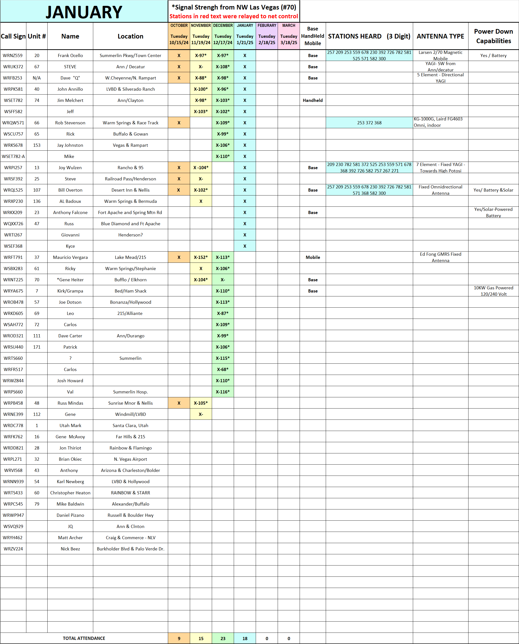 Be advised in order to streamline and make this net more effective we are going to do things a bit differently next month. My understanding of a simplex net is not only for us to test our equipment but to see how far and where we are reaching while in simplex mode. For us to do that effectively we need data from everyone involved. So while doing roll call on simplex I need each of you to keep track of who you are hearing. You do not need to provide the entire call sign, just the suffix, so for instance if you hear me you will note down 257 (more on this later). IN ORDER FOR THIS TO WORK, I NEED EVERYONE TO STANDBY UNTIL YOUR NAME IS CALLED, PLEASE NO BREAKS OR COMMENTS, YOU WILL GET A CHANCE AT THE COMPLETION OF ROLL CALL.