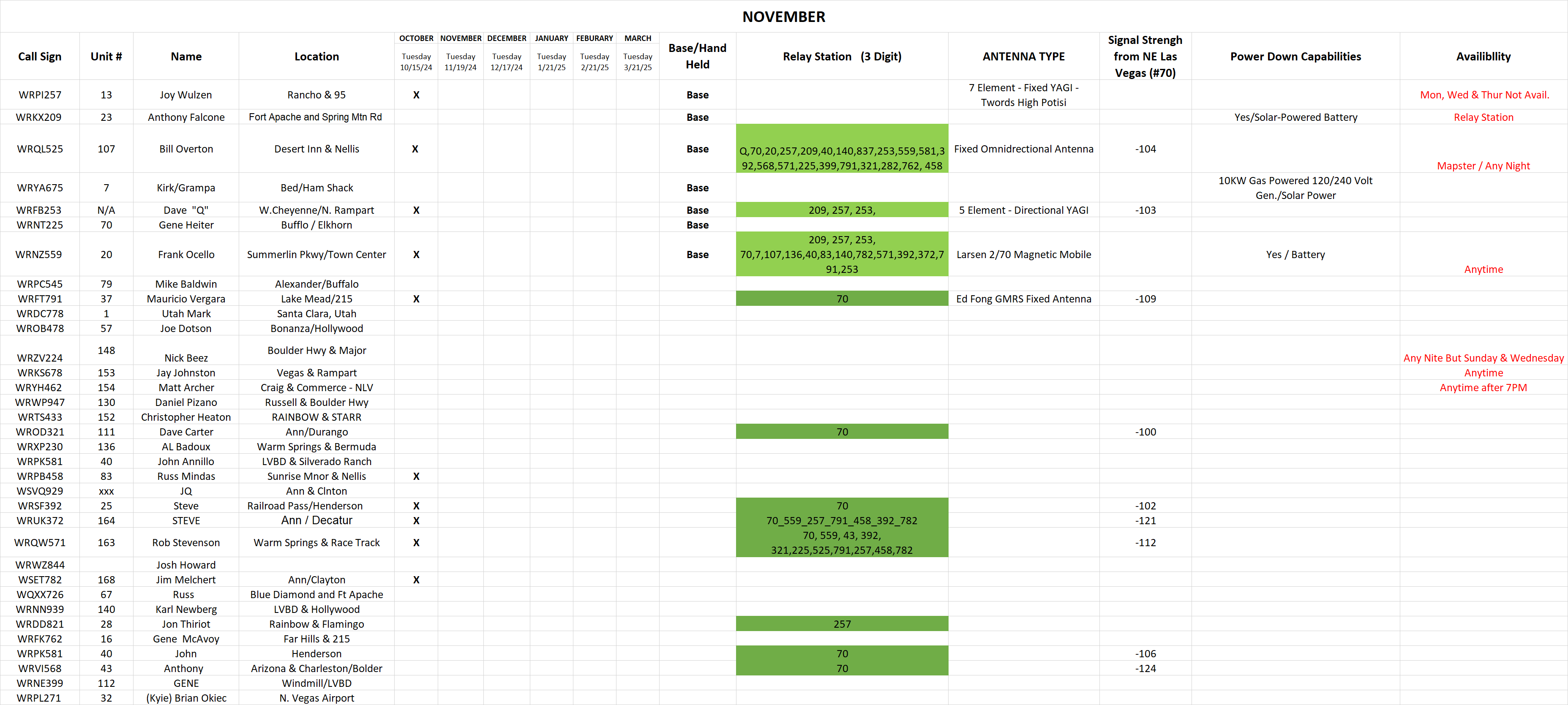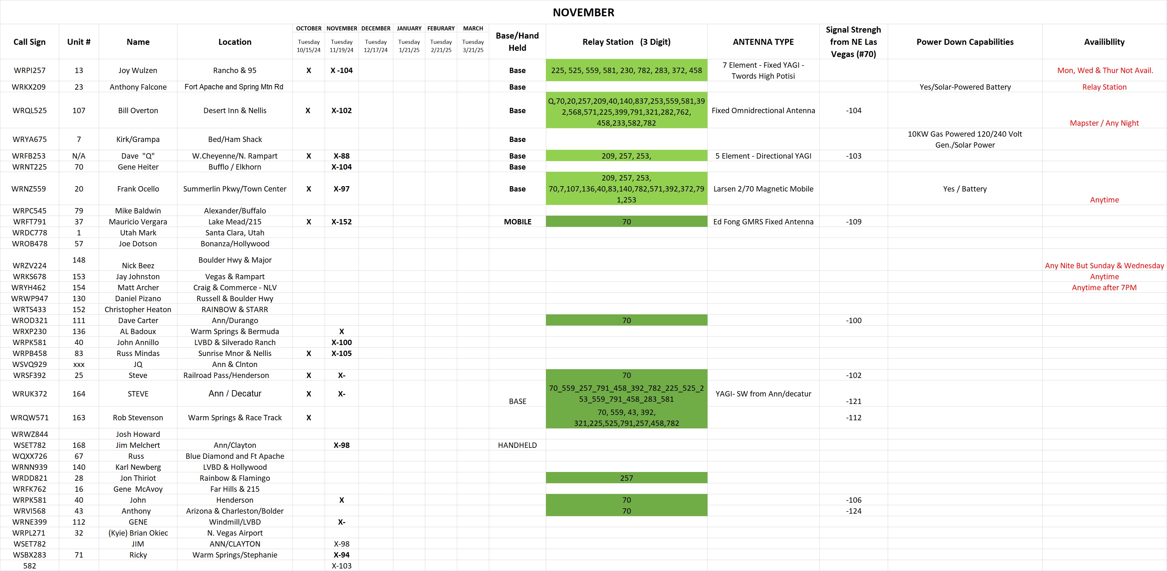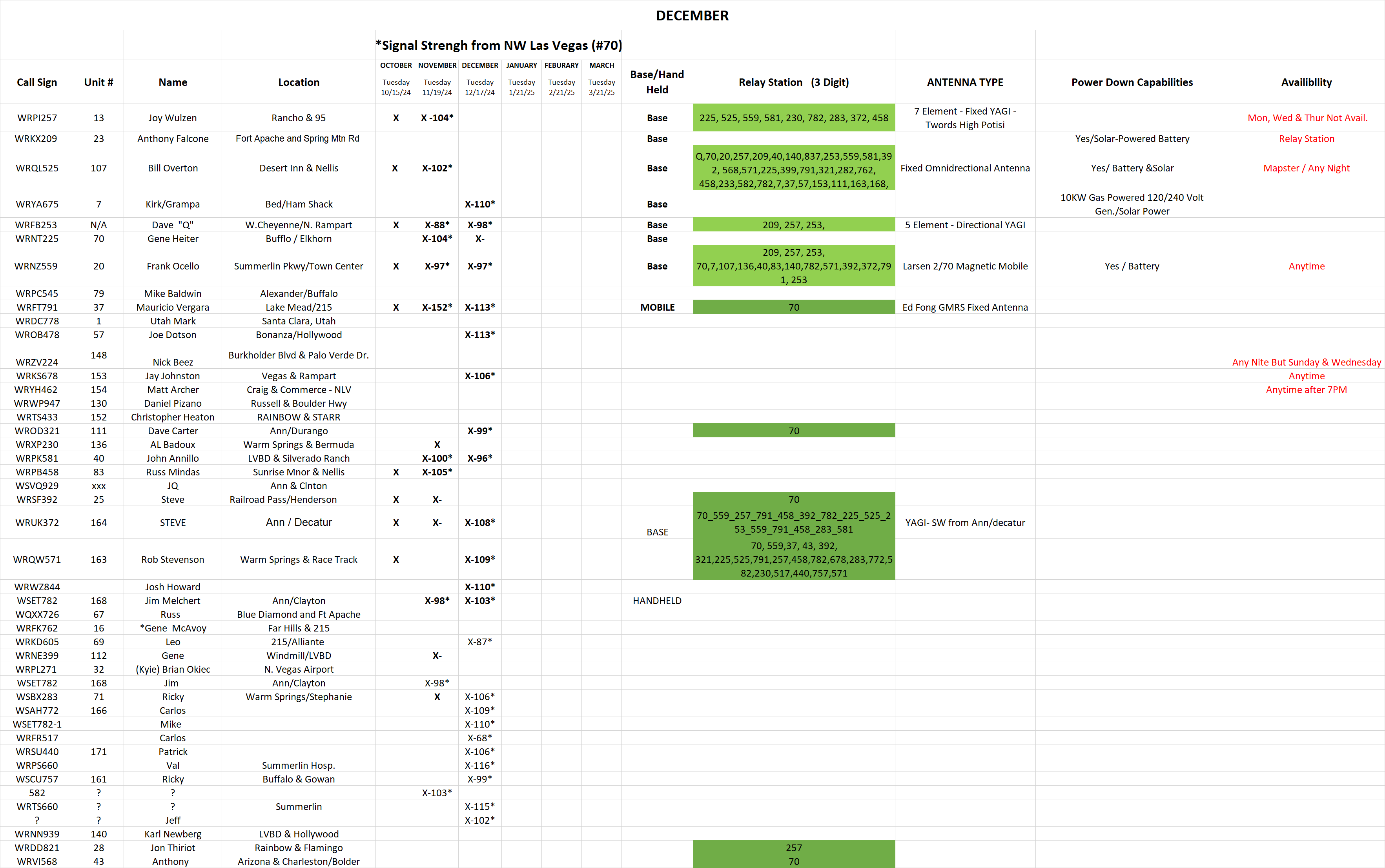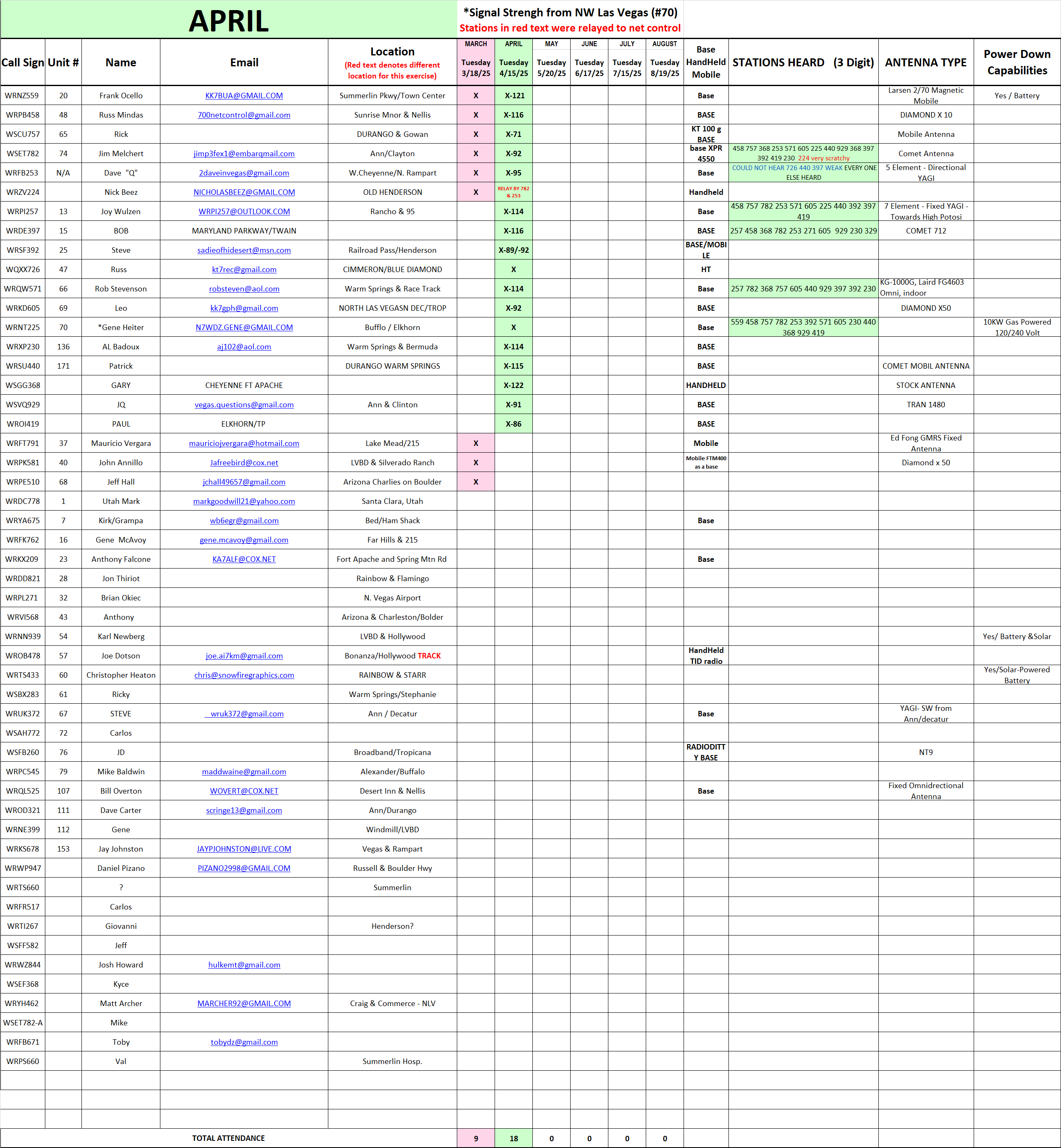 Be advised in order to streamline and make this net more effective we are going to do things a bit differently next month. My understanding of a simplex net is not only for us to test our equipment but to see how far and where we are reaching while in simplex mode. For us to do that effectively we need data from everyone involved. So while doing roll call on simplex I need each of you to keep track of who you are hearing. You do not need to provide the entire call sign, just the suffix, so for instance if you hear me you will note down 257 (more on this later). IN ORDER FOR THIS TO WORK, I NEED EVERYONE TO STANDBY UNTIL YOUR NAME IS CALLED, PLEASE NO BREAKS OR COMMENTS, YOU WILL GET A CHANCE AT THE COMPLETION OF ROLL CALL.