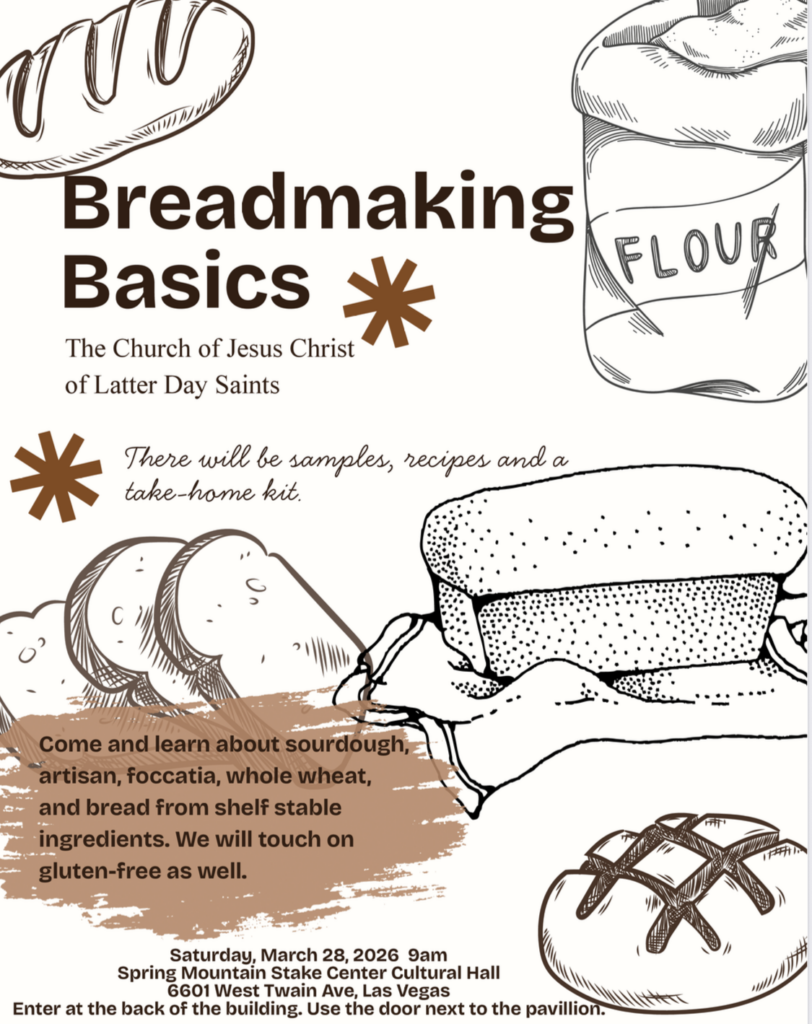 ![]() The Church of Jesus Christ of Latter-Day Saints-Twain Located in the Spring Mountain Stake Center Cultural Hall located at 6601 W. Twain Ave, Las Vegas. ENTER AT THE BACK OF THE BUILDING, USE THE DOOR NEXT TO THE PAVILLION Come and learn about sourdough, artisan, focaccia, whole wheat and bread from shelf stable ingredients. |