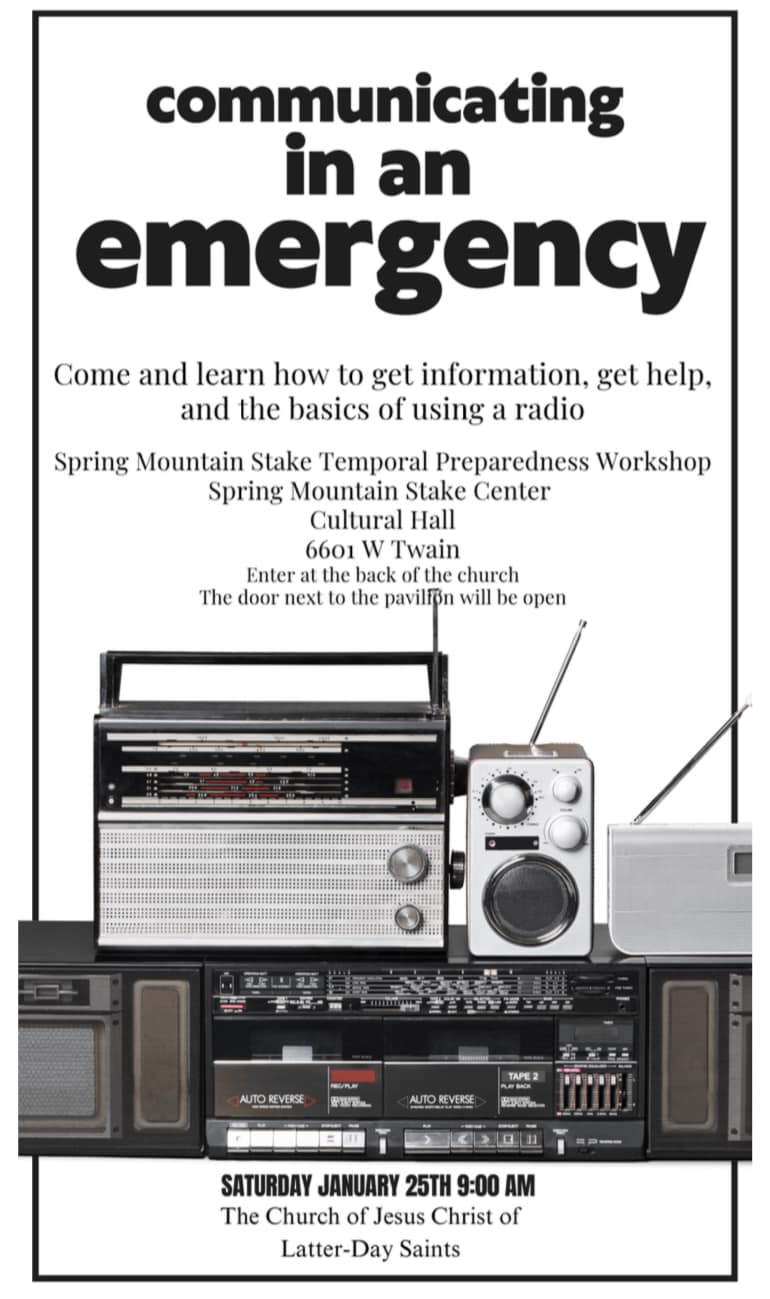 Category: In Person Event Communicating in an Emergency WorkshopBy Joy-WRPI 257 / January 24, 2025 9:00 am - In Person EventIn Person Event The Church of Jesus Christ of Latter-Day Saints6601 W. TwainLas Vegas, NV 89103View LocationMap The Church of Jesus Christ of Latter-Day Saints